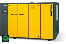 SM SFC to HSD SFC series compressors from Kaeser are exceptionally efficient variable-speed rotary screw compressors. SM, SK and ASK SFC models use Kaeser’s minimal maintenance V-belt drive system, which features automatic belt tensioning to ensure optimum power transmission. Larger models from the ASD SFC upwards are equipped with the speed-controlled 1:1 direct drive.